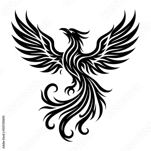Vector Image of Phoenix Tribal Design: Mythology's Mystical Black Silhouette of a Mythical Bird in Ornate Illustration