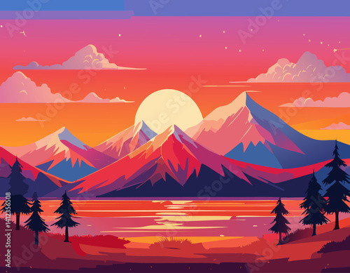 Vector landscape of majestic mountains and pine trees at sunset, with colorful gradients of pink, orange, and purple sky reflecting on a calm lake. Ideal for travel, nature