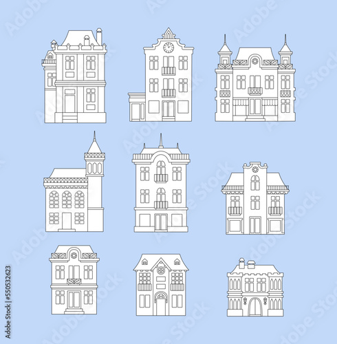 Vector line art illustration. Set of nine various old style houses with towers and balconies on blue background.