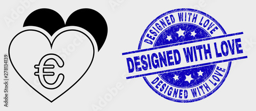 Vector linear euro love hearts icon and Designed with Love stamp. Blue rounded scratched seal stamp with Designed with Love text. Black isolated euro love hearts icon in contour style.
