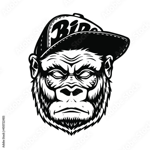 Vector logo illustration, angry, funny gorilla head in a baseball cap, isolated image, on a white background