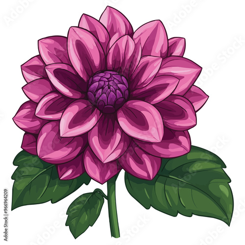 vector magenta dahlia flower clipart with green leaves on the stem