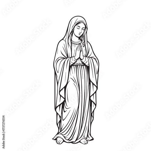 Vector minimalist artwork of the Virgin Mary statue, monochrome black and white with bold black outline, emphasizing sacred symbolism, purity, faith, and divine presence.
