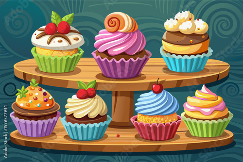 vector of Several models of cupcakes in beautiful variations on a wooden stand. Great idea for a coffee shop