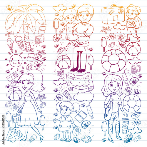 Vector pattern. Summer vacations. Little children. Happy family with kids. Travel and adventures. Beach, ocean, island, sun