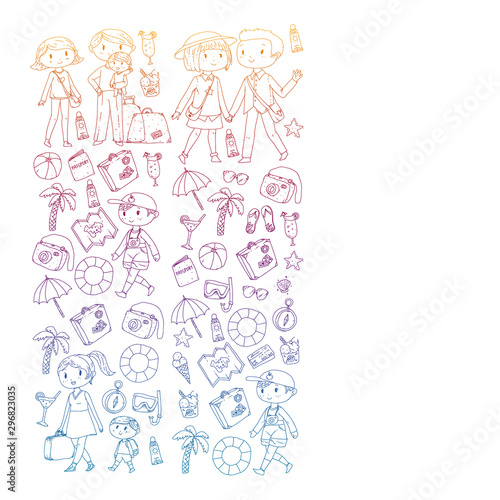 Vector pattern with travel and beach icons. Parents with little kids. Children summer vacation.