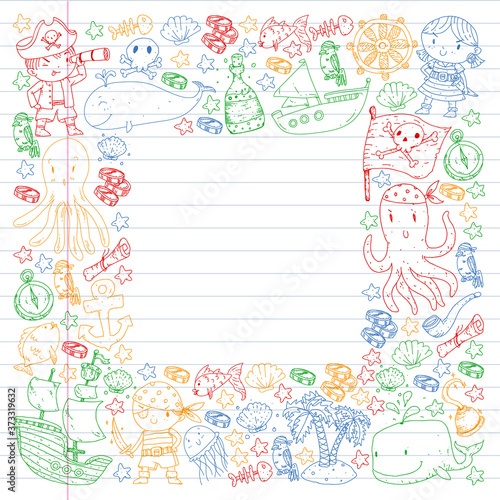 pirate, octopus, ship, parrot, cartoon, set, treasure, island, crab, background, anchor, whale, mermaid, fish, illustration, skull, vector, map, design, gun, wheel, bottle, adventure, sea, hat, character, children, icon, travel, children, smile, people, cannon, ocean, captain, sailor, bird, collection, comic, element, sail, isolated, happy, flag, sword, boat, barrel, kindergarten, imagination, creativity