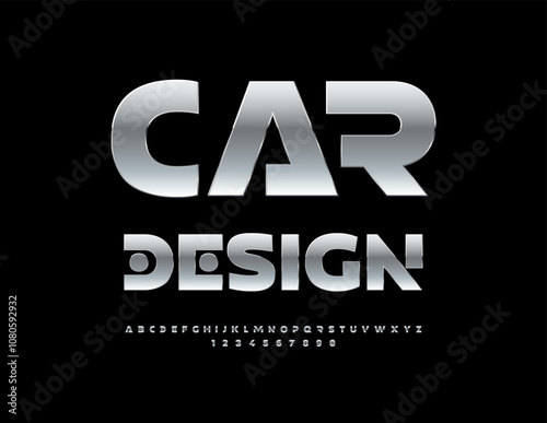 Vector quality icon Car Design. Unique Silver Font. Digital Metallic Alphabet Letters and Numbers set.