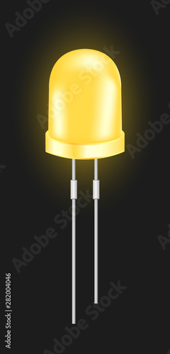 Vector realistic 3d yellow light emitting diode – small LED light bulb isolated on a black background. Semiconductor diode – electrical component.
