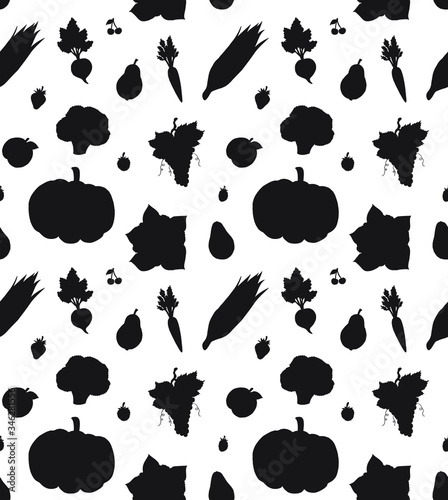 Vector seamless pattern of black doodle fruit and vegetables silhouette isolated on white background