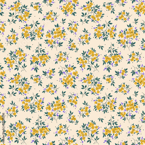 Vector seamless pattern. Pretty pattern in small flowers. Small yellow flowers. White ivory background. Ditsy floral background. The vintage template for fashion prints. Stock vector.