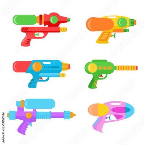 Vector set of colorful water guns for Songkran Festival Thailand Holidays, plastic toy guns pistols isolated on white background, flat design Illustration. Fun summer water splash game, play concept.