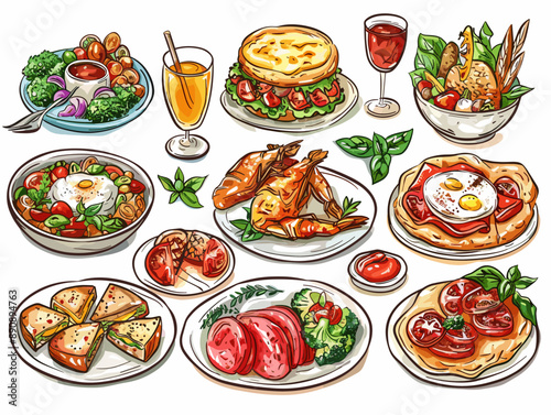 Vector set of different dishes on a white background. Vector illustration.