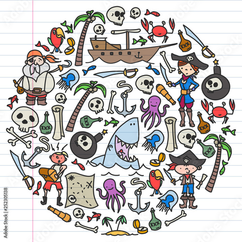 Vector set of pirates children's drawings icons in doodle style. Painted, colorful, pictures on a piece of linear paper on white background.