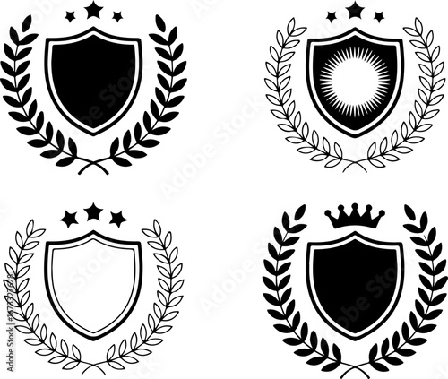 Vector shield and laurel wreath template set in sleek black color with a shiny metallic effect, perfect for logo design, branding, emblems, or insignias.