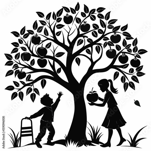 tree, silhouette, woman, love, couple, vector, illustration, nature, people, park, spring, family, children, flower, grass, abstract, landscape, sky, happiness, kiss, black, floral, summer, leaf, children