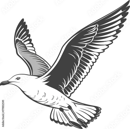Vector silhouette illustration of black-headed gulls and a white dove with spread wings in flight