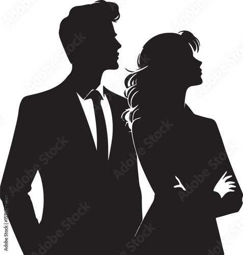 Vector silhouettes of a man and a woman, a couple of business people standing in profile, looking up, black color on a white background