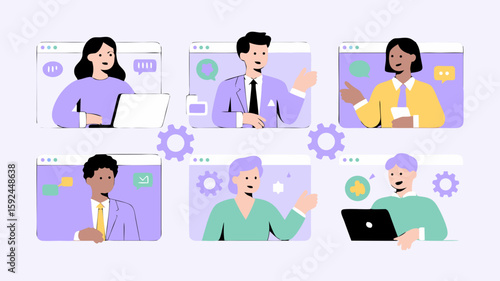Vector SVG Illustration of Diverse People Communicating with Chat Bubbles and Gear Icons in Modern Flat Style for Digital Media