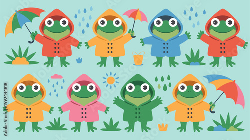 Vector SVG Illustration of Frogs with Raincoats and Umbrellas in Modern Flat Style with Bright Colors