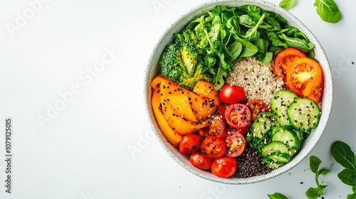 vegan breakfast bowl, colorful veggies and quinoa, balanced and modern, clean style, isolated on white background