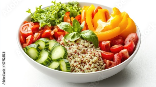 vegan breakfast bowl, colorful veggies and quinoa, balanced and modern, clean style, isolated on white background
