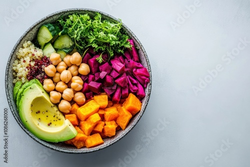 Vegan Buddha Bowl with Quinoa, Chickpeas, Avocado, Sweet Potatoes, and a Rainbow of Fresh Vegetables in a Healthy and Colorful Arrangement