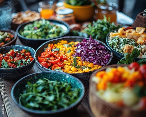 Vegan cuisine with colorful plant-based dishes on a table, vibrant atmosphere, close-up, sharp focus, bright lighting