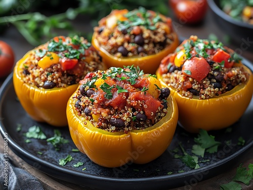Vegan stuffed bell peppers with quinoa, black beans, and a tomato sauce, baked and topped with fresh herbs, Vegan stuffed peppers, wholesome dinner