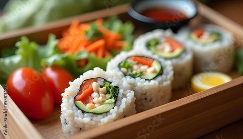 vegan, sushi, carrot, avocado, corn, rice, seaweed, nori, maki, vegetable, vegetarian, healthy, fresh, food, meal, snack, japanese, cookery, dish, plate, wooden, box, container, salad, green, lettuce, tomatoes, cherry, red, yellow, lemon, ginger, wasabi, soy, sauce, dipping, chopstick, macro, delicious, appetising, tasty, epicure, home, cooked, homemade