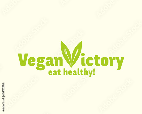 Vegan Victory Abstract Vector Sign, Emblem or Quote. Fork and Knife in a Leafs Concept.