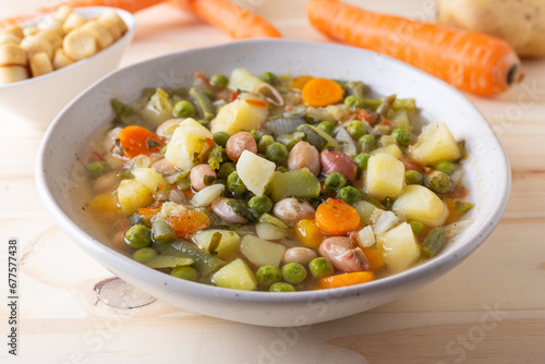 Vegetable and legume minestrone served with croutons. Complete vegan dish ideal for lunch and dinner. Italian minestrone.