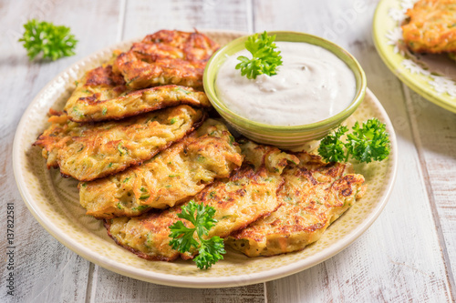 Vegetable fritters with potato, carrot, zucchini served with Ranch sauce.