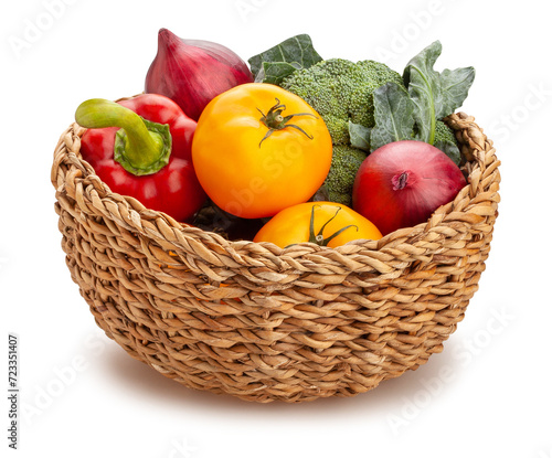 vegetable, mix, basket, cut-out, colourful, background, bell pepper, black, broccoli, clipping, clipping path, closeup, food, fresh, green, group, heap, ingredient, isolated, leaf, many, nobody, nutrient, nourishment, path, pepper, raw, red, ripe, side, stack, studio, tasty, tomatoes, high-coloured, white, whole, yellow, yellow tomato, wicker, onion, round