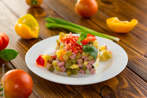 vegetable salad of boiled vegetables, with peas, sausage, sweet pepper. On a wooden table