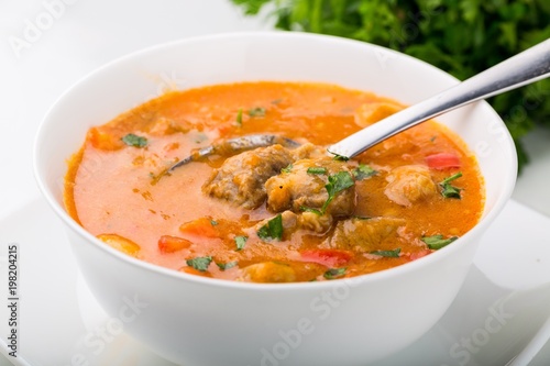 vegetable, beef, meat, food, bowl, spoon, healthy lifestyle, epicure, lunch, closeup, pepper, dinner, parsley, onion, horizontal, high key, herb, scented, beef stew, carrot, chili pepper, color image, cooked, fine dining, freshness, goulash, gravy