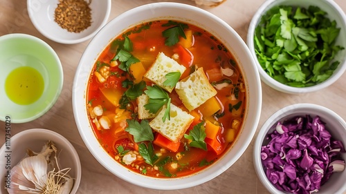 vegetable soup with croutons, parsley, garlic - small bowls around with ingredients - seen from above