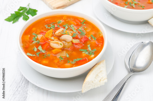 soup, tomatoes, bean, vegetable, minestrone, vegetarian, legume, food, bread, bell pepper, bowl, broth, celery, carrot, closeup, cooked, dinner, dish, epicure, green, healthy, healthy eating, herb, homemade, lunch, meal, nobody, organic, pepper, plate, red, seasoning, snack, vegetarian food, parsley, baguette