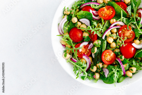 Vegetarian chickpea salad with tomatoes, arugula, parsley, spinach and red onion. Healthy food, diet. Top view