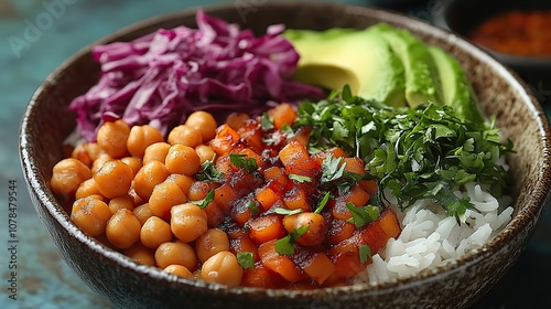 vegetarian dinner vegetables rice micro greens avocado bowl with chickpeas top view copy space