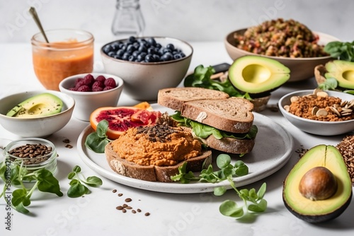 Vegetarian healthy meal with fresh and dried fruits, berries, juices, vegetable cream. Concept of diet, weight loss, healthy lifestyle and nutrition. Generative AI