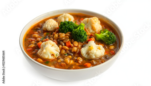vegetarian, lentil, soup, cauliflower, broccoli, isolated, healthy, alimentary, hearty, filling, easy, comfort food, vegan, protein, fiber, vitamin, mineral, low-calorie, low-fat, versatile, customizable, simple, quick, delicious, satisfying
