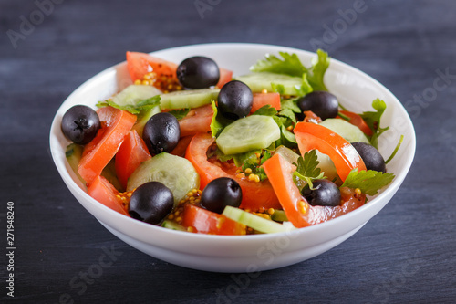 Vegetarian salad of tomatoes, cucumbers, parsley, olives and mustard on black wooden background.