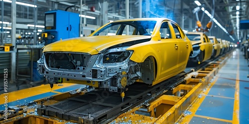 car, line, factory, manufacturing, production, robot, technology, tech, high technology, vehicle, suv, luxury, lighting, welding, site, colours, white, red, assembly, engineering, automation, innovation, performance, assembly line