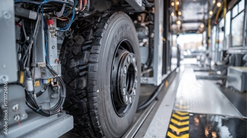 tire, truck, vehicle, maintenance, inspection, wheel, repair, industrial, automotive, commercial, transportation, machinery, technology, engineering, detail, closeup, tread, rim, black, grey, workshop, industry, equipment, detailing, professional, service, support, quality, work, safety, detail, infrastructure, large, manufacturing, modern, closeup, high, day, indoor