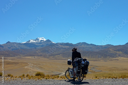 bike, bicyclist, mountain, travel, route, snow, baggage, traveler, heaven, blue, grass, yellow