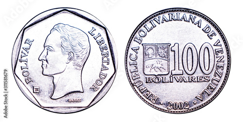 Venezuelan coin one hundred bolarev 2002 release, Simon Bolivar head, silver. Concept for design. Currency devaluation.