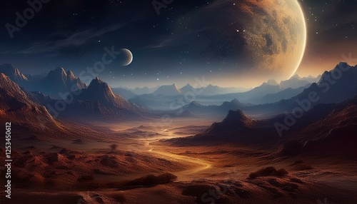 venus landscapes concept, the venus surface with dark night universe in background with stars