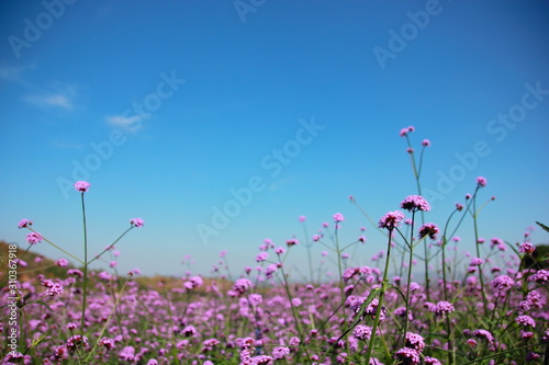 Verbena purple flowers in the garden on blue sky, purple flower vintage, blurred and soft background.