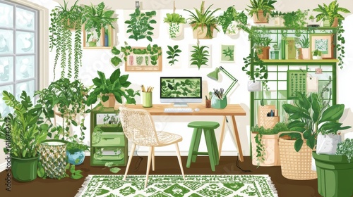 home, office, workspace, greenery, plant, potted, hanging, wall, shelf, decor, design, interior, aesthetic, minimalist, cosy, calm, natural, tropical, lush, vibrant, green, botanical, decorative, art, illustration, wooden, desk, computer, chair, rug, basket, storage, jar, accessory, light, lamp, supply, colourful, patterned, furniture, room, modern, vintage, stylish, bright, calmness, peaceful